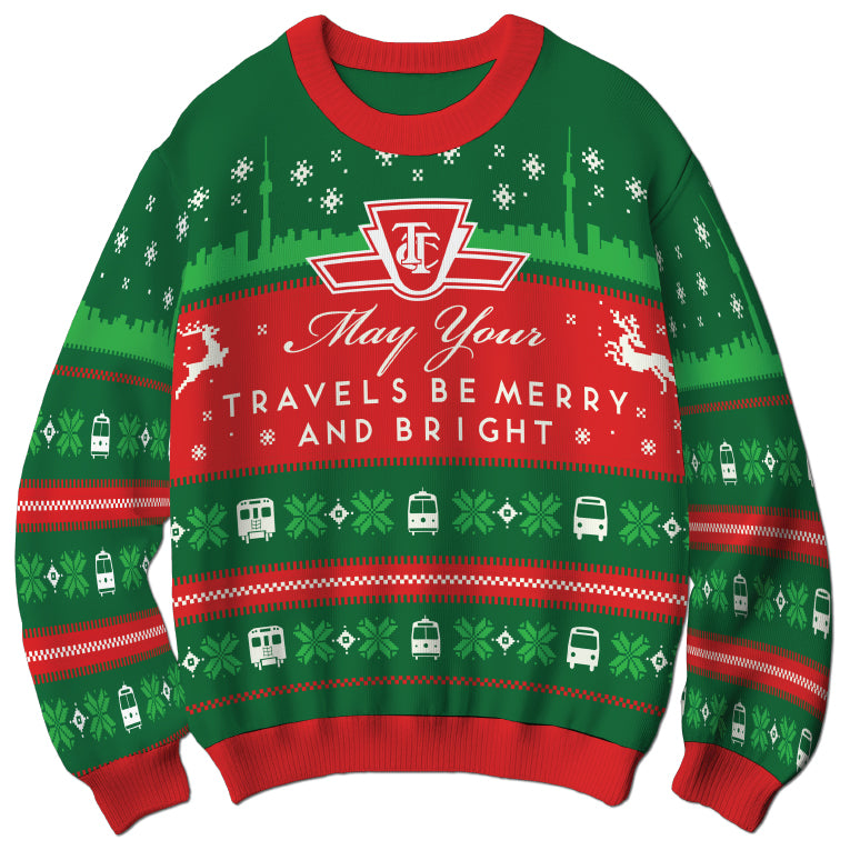 Ugly has never looked so good. Steal the spotlight with this playful homage to the classic Ugly Holiday Sweater. Sprinkled with festive details, this sweater celebrates the TTC and our love for Toronto. The bold colours and instantly recognizable keystone logo are sure to spark conversations.